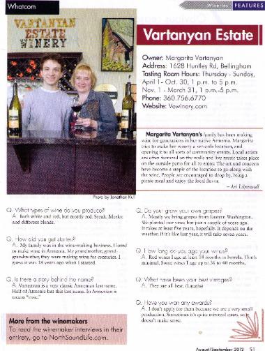 Vartanyan Estate Winery is featured in Wine Press Northwest as Top-Of-The-Scale Boutique winery. Northwest Washington boutique wineries carve out niche in expanding industry By Dan Radil, Special to Wine Press Northwest, March 14, 2016. Top-Of-The-Scale Boutique Originally from Siberia, Margarita Vartanyan of Vartanyan Estate Winery was visiting friends in western Canada when she took a drive through nearby Bellingham and announced, “That’s the place I want to live.”.... http://www.winepressnw.com/2016/03/14/3978962_northwest-washington-boutique.html?rh=1 |